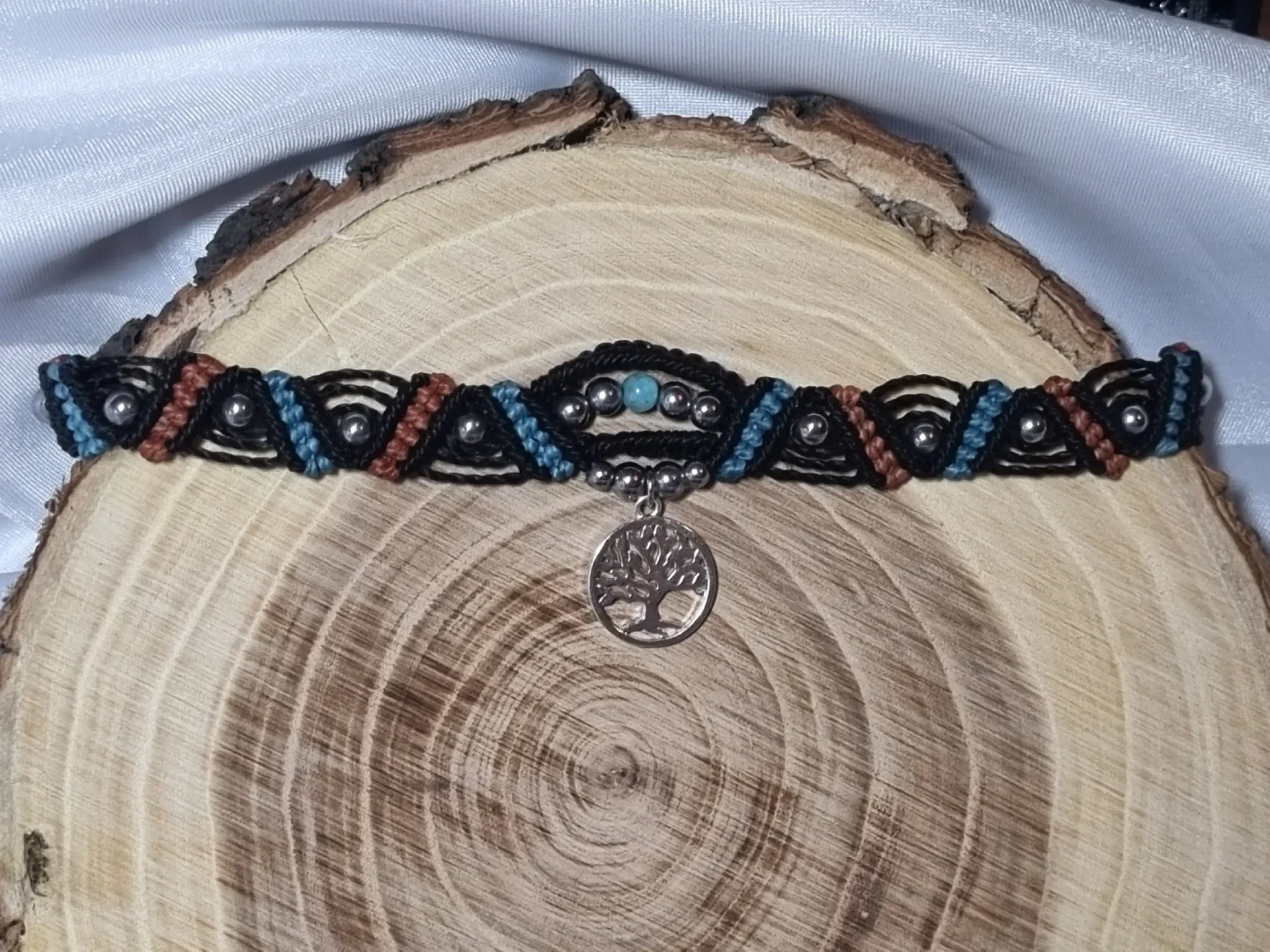 Laissez-vous inspirer par ce bracelet artisanal au design sophistiqué et spirituel. Le tissage précis en fil Linhasita noir est rehaussé par des touches de bleu turquoise et de terre cuite, créant un contraste saisissant qui met en valeur l'Amazonite verte. Symbole de croissance et de connexion, la breloque Arbre de Vie vient parfaire ce bijou, faisant de lui un véritable talisman à porter au quotidien.