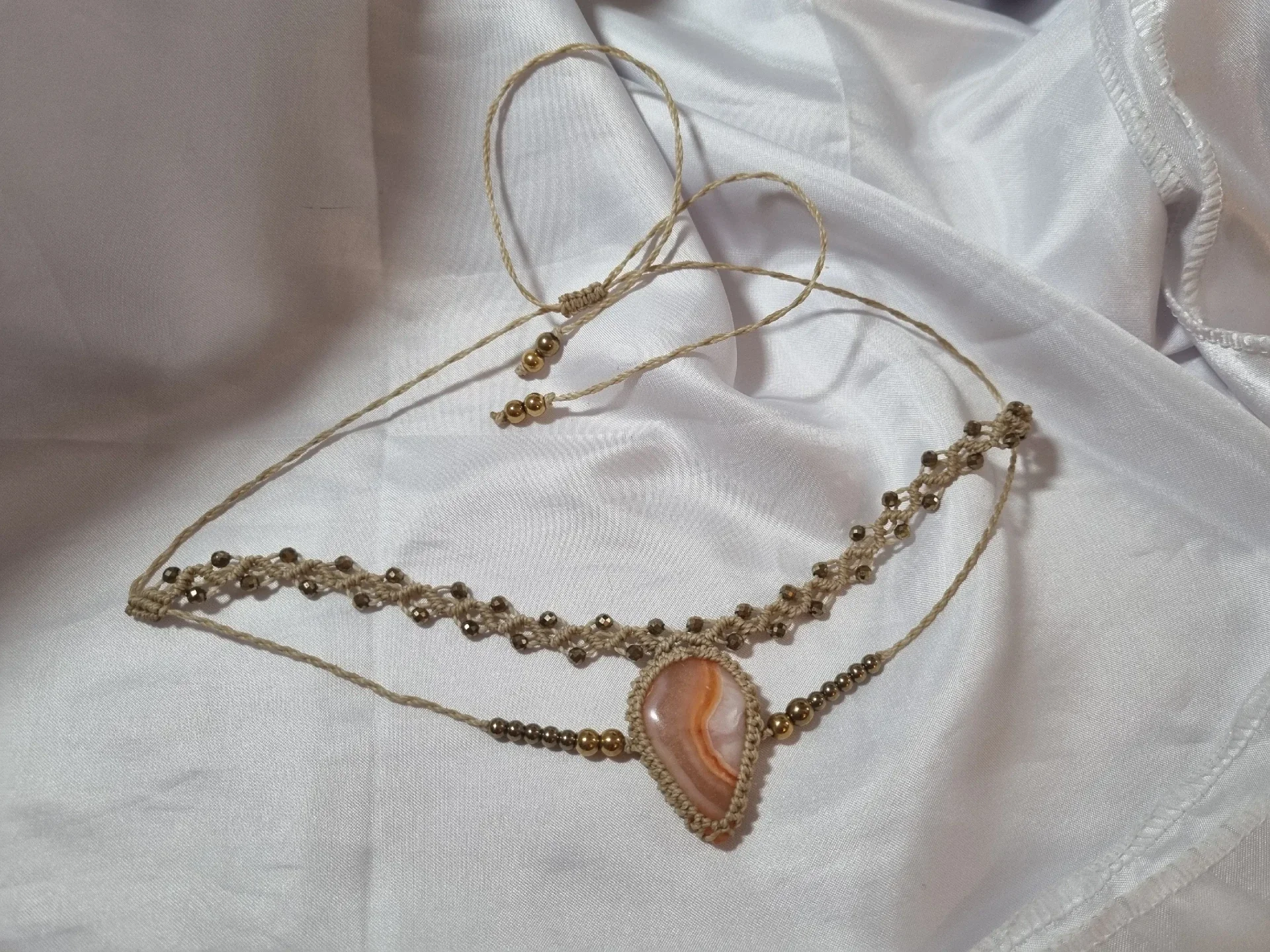 Laissez-vous séduire par ce collier choker au design aérien et raffiné. Conçu pour épouser parfaitement la base du cou, ce bijou met en lumière une Agate aux teintes douces et rubanées. L'entrelacement du fil Linhasita beige et des perles d'Hématite aux finitions dorées crée une parure lumineuse, idéale pour apporter une touche de sophistication naturelle à votre décolleté.