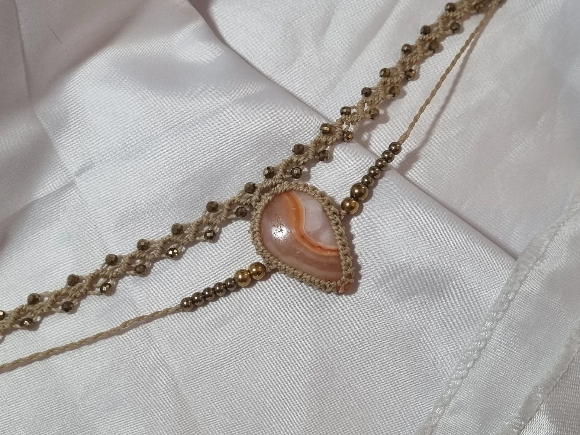 - Douceur et Protection : La couleur beige du fil et les tons chauds des pierres créent une bulle de réconfort et de protection au quotidien.